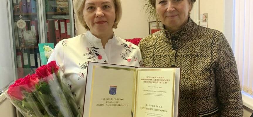 Депутат Законодательного собрания Ленинградской области Светлана Потапова тепло поздравила Екатерину Владимировну с Днем рождения и выполнила приятную миссию – за многолетний добросовестный труд вручила Почетный Диплом Законодательного собрания Ленинградской области.