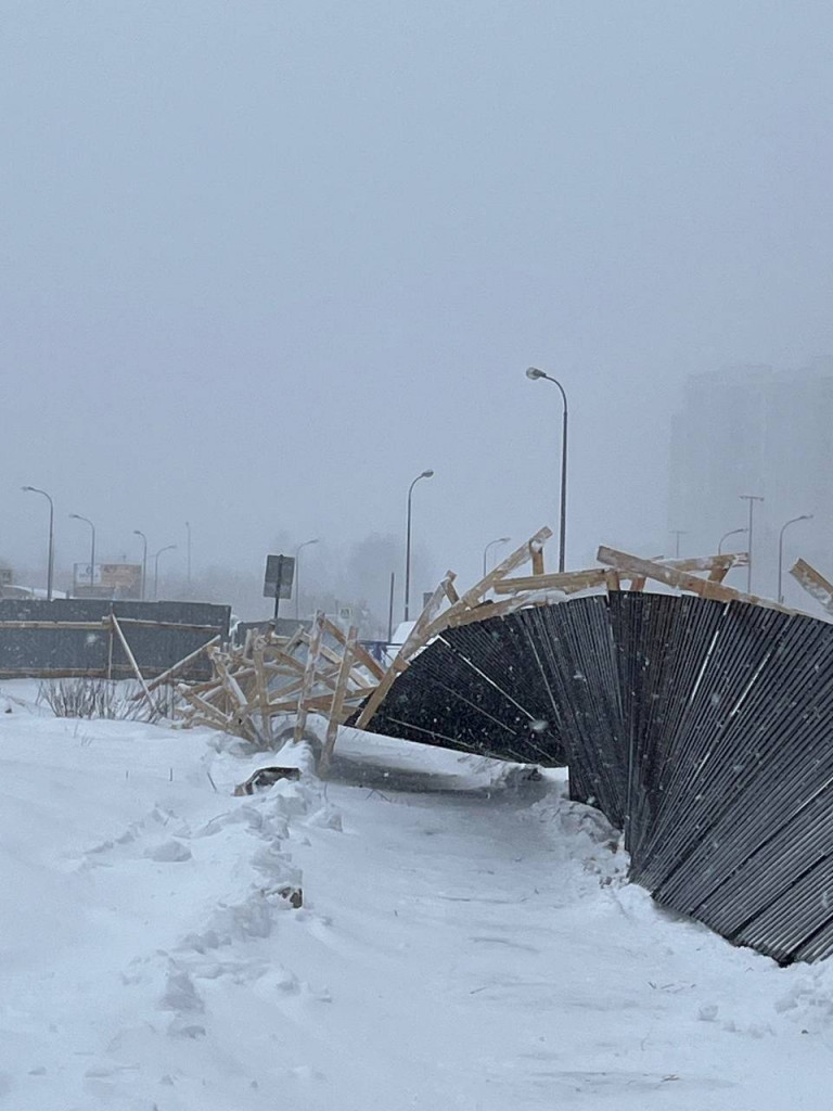 А в Кудрово ветер даже повалил металлический забор, деревянные конструкции сложило на землю: