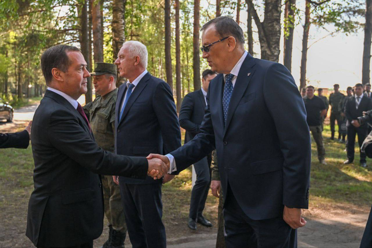 Заместитель председателя Совета безопасности РФ Дмитрий Медведев посетил военный полигон Песочненский в Ленинградской области.