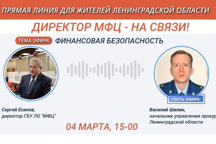 Горячая линия пройдет в понедельник, 4 марта, с 15 до 16 часов. В прямом эфире на вопросы граждан ответят начальник управления по надзору за уголовно-процессуальной и оперативно-разыскной деятельностью прокуратуры Ленинградской области Василий Шилин и директор МФЦ Ленинградской области Сергей Есипов.