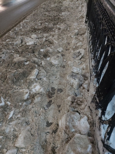 «Пешеходная зона Пешеходного моста в 7.30 утра. Дорогу почистили, а пешеходы, видимо, обойдутся. И так проползут», - пишет Ольга.