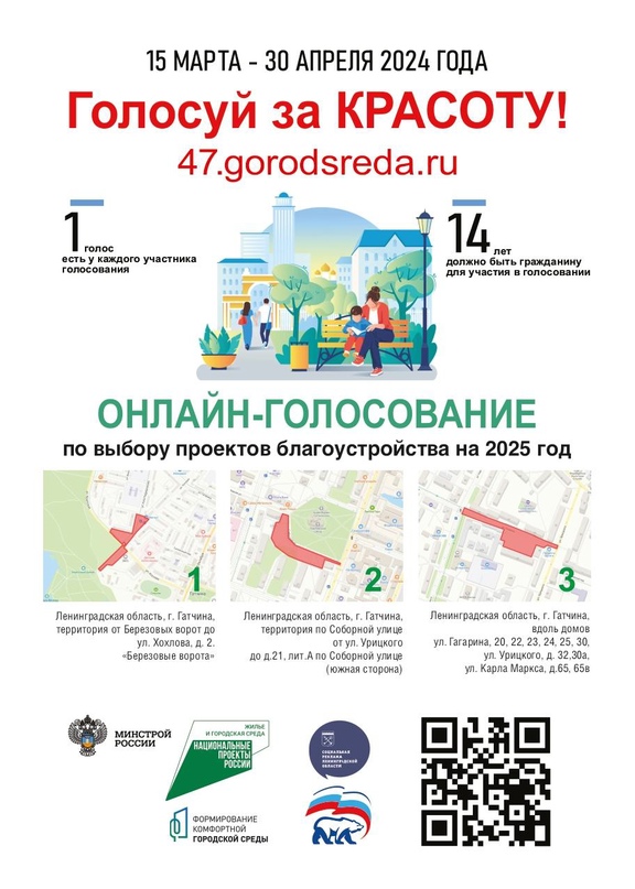 Уважаемые жители и гости Гатчины! Сейчас проходит Всероссийское онлайн-голосование за объекты благоустройства, которое стартовало 15 марта и продлится по 30 апреля 2024 года.