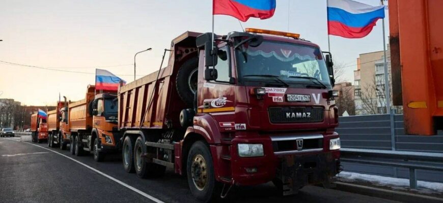 Результат – впечатляет. Мост выглядит по-настоящему величественно. Грузовые КАМАЗы, украшенных трёхцветными российскими флагами, на новеньком дорожном покрытии кажутся совсем небольшими – почти игрушечными.