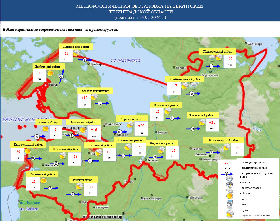 Как сообщает ГУ МЧС России по Ленинградской области , 16 мая ожидается переменная облачность. Ночью осадков не ожидается, днем пройдет кратковременный дождь. Температура воздуха днем +18…+23 градуса в большинстве районов, но на востоке может быть прохладно – до +14 градусов. Ночью +6…+11 градусов.