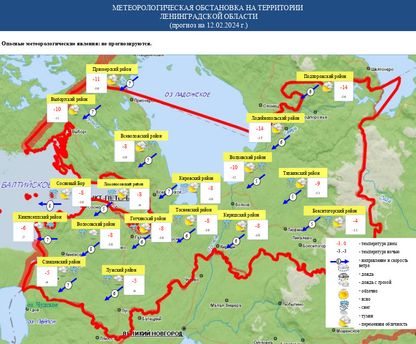 Как сообщают в пресс-службе главного Управления МЧС РФ по Ленинградской области со ссылкой на прогноз погоды от синоптиков ФГБУ "Северо-Западное УГМС", в понедельник, 12 февраля, на территории 47-го региона ожидается небольшой снег и морозы до -23 градусов.