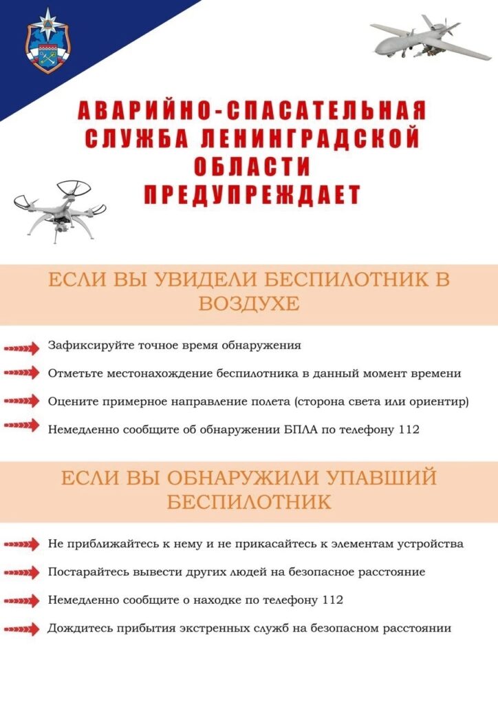 Аварийно-спасательная служба Ленинградской области напоминает, что в Российской Федерации действует запрет на публикацию материалов, содержащих кадры работы ПВО.