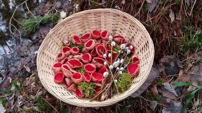 Охотники уже с 31 марта собирают корзины с «эльфовой чашей». Так, леса в Ломоносовском, Тосненском и Гатчинском районах оказались богатыми на алые грибы. О своём улове грибники рассказали в группе во «ВКонтакте» «Грибы и Грибники СПб».