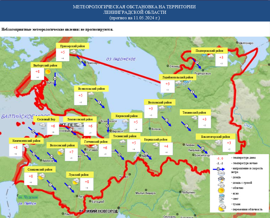 В субботу, 11 мая, в Ленинградской области ожидается облачная погода с прояснениями. После заката в большинстве районов возможен небольшой, иногда умеренный дождь, а в отдельных районах - смешанные осадки с мокрым снегом. После рассвета местами ожидается небольшой дождь.